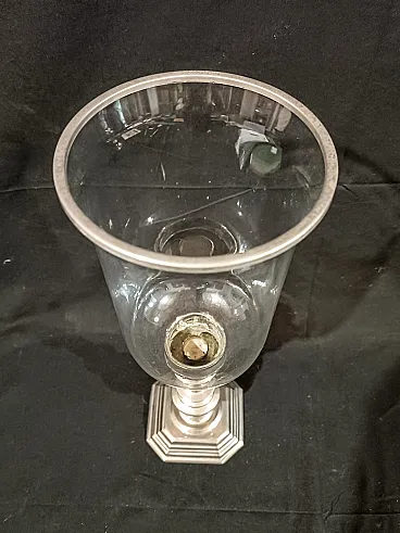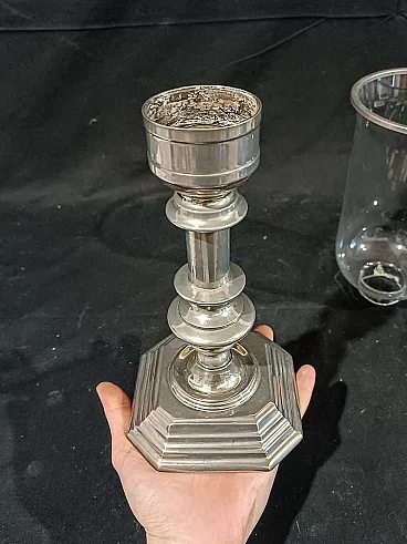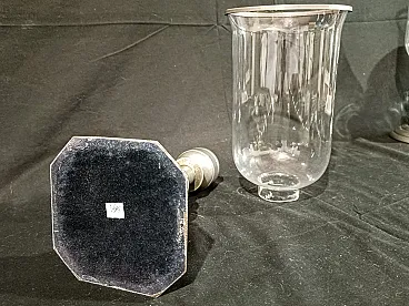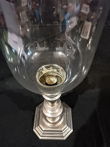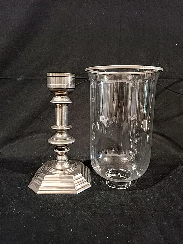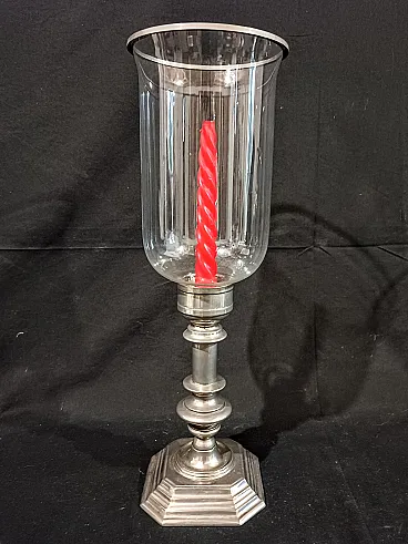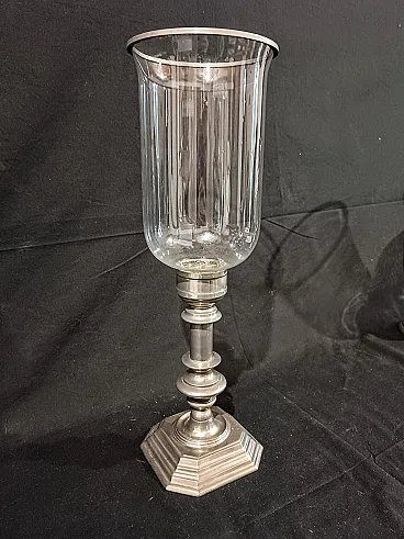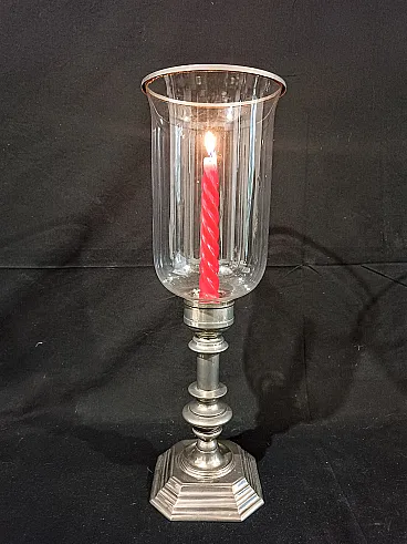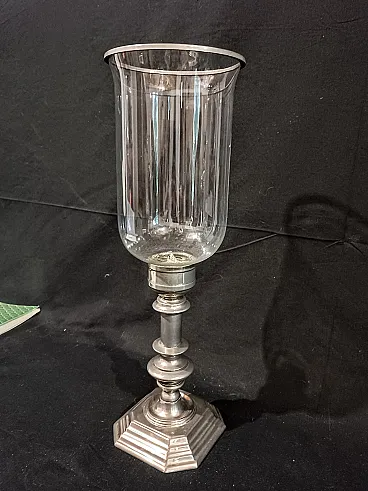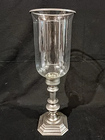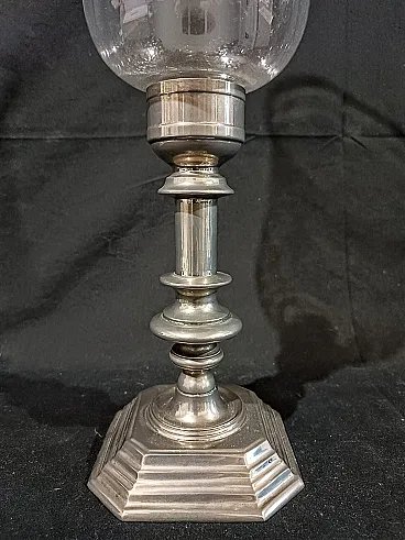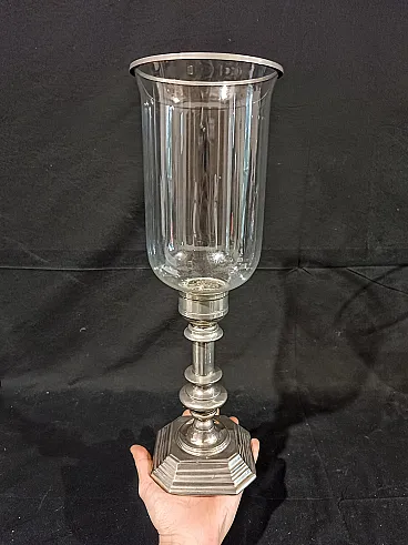 Grande candeliere in metallo argentato di manifattura italiana risalente agli anni 60/70 del '900. La base ottagonale é elegante, ottenuta tramite fusione, e sostiene un fusto tornito e argentato. Sulla sommità si inserisce il paralume in vetro soffiato, a campana rovesciata con anello in metallo argentato a terminare. Il vetro è di alta qualità, soffiato a mano e sottilissimo, piccole occlusioni e imperfezioni testimoniano la produzione artigianale avvenuta tramite soffiatura. Misure: Base 12,7 x 12,7 cm, altezza 22,8 cm Cristallo diametro massimo 14,3 cm, altezza 23,3 cm Altezza totale del candeliere con paralume 44 cm Guarda anche gli altri oggetti che ho in vendita:-)