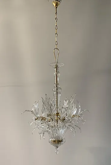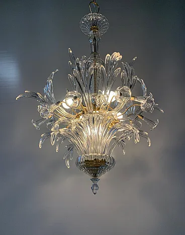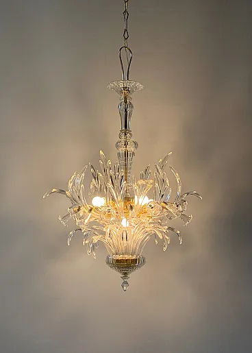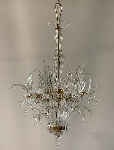 Lampadario a sospensione di grande raffinatezza e presenza scenica, realizzato prevalentemente in vetro soffiato trasparente e caratterizzato da una composizione ricca e articolata. La struttura centrale si sviluppa in verticale con una linea slanciata ed elegante, composta da elementi in vetro lavorato e tornito che si susseguono con equilibrio e precisione, creando un asse decorativo continuo dal punto di attacco al soffitto fino alla parte inferiore. Il corpo luminoso principale è costituito da una fitta corona di elementi in vetro sagomati a forma di foglie, petali o germogli, disposti radialmente in più livelli, dando vita a una composizione floreale ricca e dinamica, quasi esplosiva, che avvolge le sorgenti luminose interne. Questi elementi, leggermente incurvati e irregolari nella forma, rifrangono la luce in modo morbido e scintillante, creando giochi di riflessi e trasparenze che valorizzano l’ambiente circostante. Le lampadine, visibili ma integrate armoniosamente nella struttura, diffondono una luce calda e avvolgente che esalta la lavorazione del vetro e ne amplifica l’effetto decorativo. Nel complesso si tratta di un lampadario imponente, ricercato e altamente ornamentale, pensato per diventare il fulcro visivo dello spazio, ideale per ambienti ampi e rappresentativi come saloni, sale da pranzo o ingressi importanti, dove possa esprimere appieno il suo carattere lussuoso, artigianale e senza tempo.