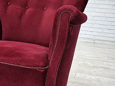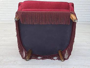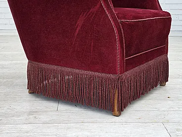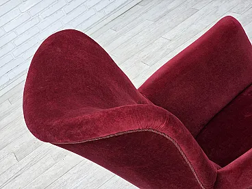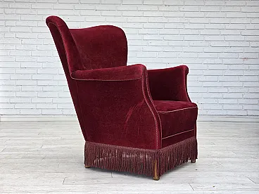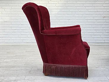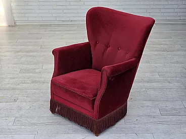 Poltrona danese in velluto rosso ciliegia, quercia, anni '70