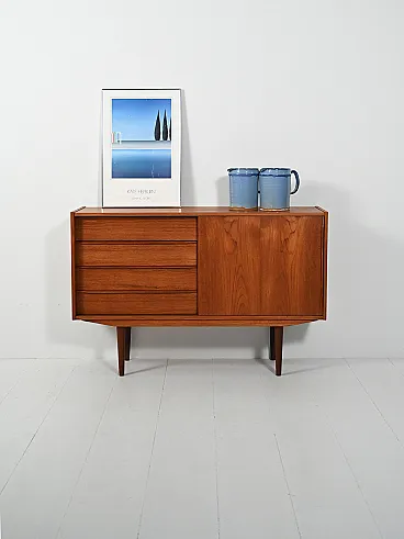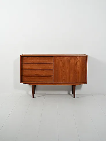 Sideboard in teak compatto a due scomparti: anta scorrevole con doppia mensola sfalsata e colonna di cassetti. Maniglie a lama, gambe tornite sottili.