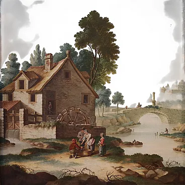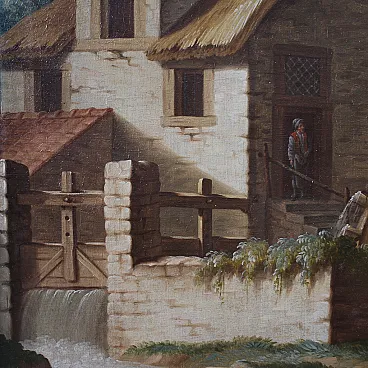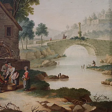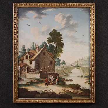 Antico dipinto italiano del XVIII secolo. Opera ad olio su tela, in prima tela, raffigurante una scena di genere rurale ambientata in un paesaggio di campagna idealizzato. Protagonista della composizione è il grande mulino ad acqua posto lungo il corso del fiume. La scena è vivacizzata da alcuni personaggi posti in primo piano: due donne e un uomo, con abiti contadini, si approcciano ad un pescivendolo.