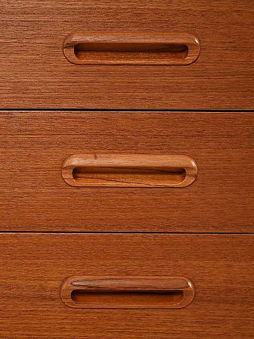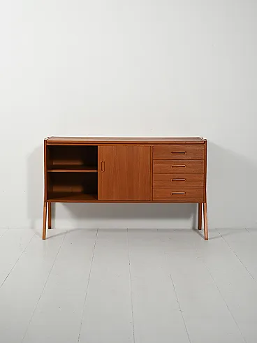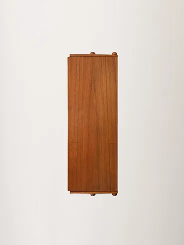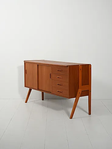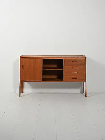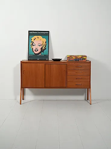 Design essenziale e armonioso in teak, valorizzato dal telaio laterale a vista che alleggerisce il profilo. Le ante scorrevoli con maniglie incassate oblunghe nascondono vani con mensola, mentre la colonna di quattro cassetti a destra riprende lo stesso dettaglio formale. Proporzioni equilibrate e finiture curate definiscono un modello sobrio e raffinato, dal perfetto stile anni 60.