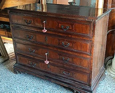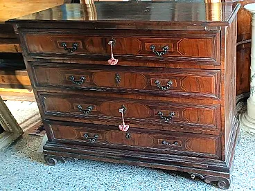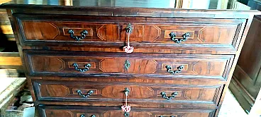 Antico cassettone a 4 cassetti in listra e massello di noce con intarsi geometrici in acero-Maniglie originali in bronzo-Piedi intagliati originali- Originale in tutte le sue parti-Fondi e retro in legno d'abete con chiodi originali-Provenienza lombardo veneto fine XVII secolo- mis.L 137 CM -P.57,5 CM -H.110 CM