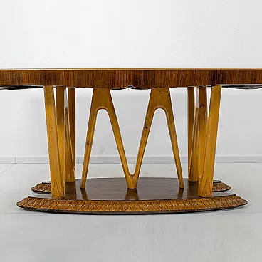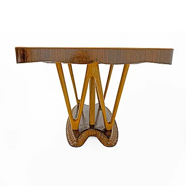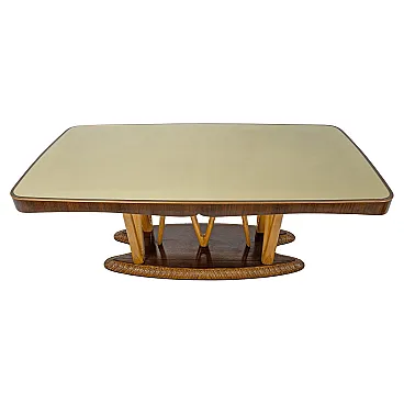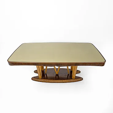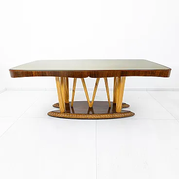 Tavolo con piano in vetro e base scultorea in acero, anni '50