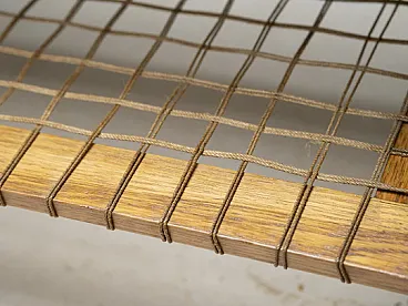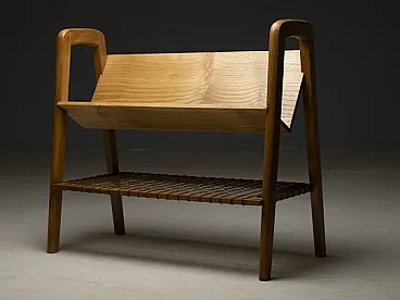 Costruito interamente in legno, il supporto presenta una forma scultorea ma pratica, con un ripiano superiore inclinato per i libri e un ripiano inferiore intrecciato che offre ulteriore spazio di archiviazione. Le venature visibili del legno e il tono caldo enfatizzano il materiale naturale ed evidenziano l'estetica sobria e utilitaristica.