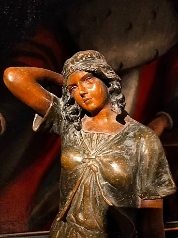 Interessante e rara scultura di odalisca in bronzo brunito e terracotta dipinta, opera del celebre maestro Enrico Lazzar (Gorizia 1865-1935), Treviso, inizi del Novecento. Secondo il timbro in argilla sul retro della base, "Ceramiche Lazzar Treviso", la scultura è databile tra il 1907 e il 1915, ultimo anno dello scioglimento dell'azienda e della sospensione della produzione per diversi anni. Dimensioni: altezza 78 cm, larghezza 25 x 22 cm.