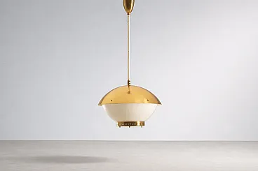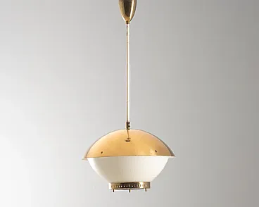 Lampada a sospensione in ottone con vetro opalino inciso, metà '900