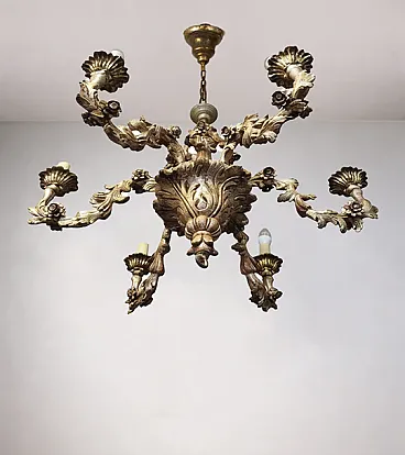Lampadario a cinque bracci in legno dorato, inizio '900