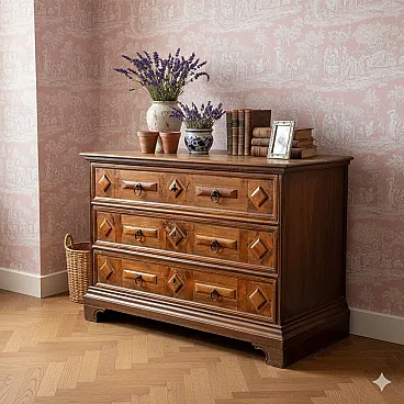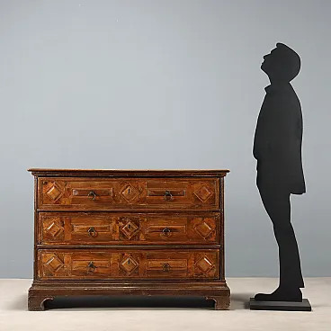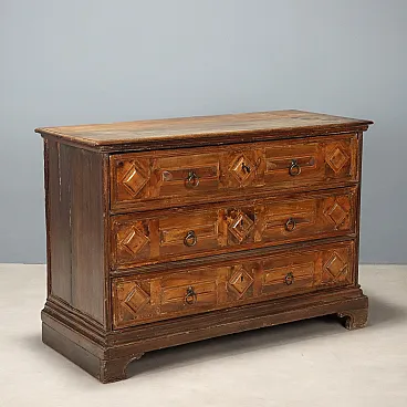 Cassettone barocco in noce, olivo, acero e mogano, primo '700