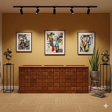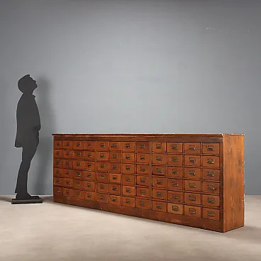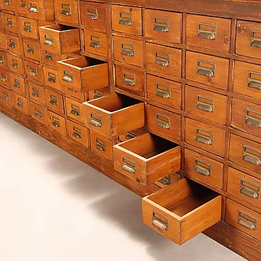 Cassettiera in abete tinto noce, vetro e lamiera, primo '900