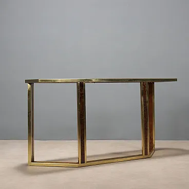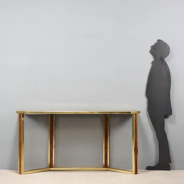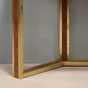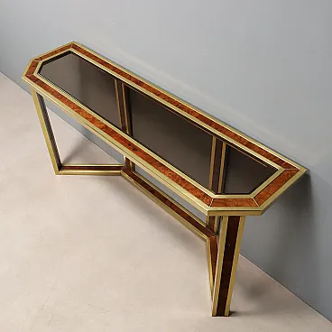 Consolle da parete in ottone, radica e vetro fumé, '900