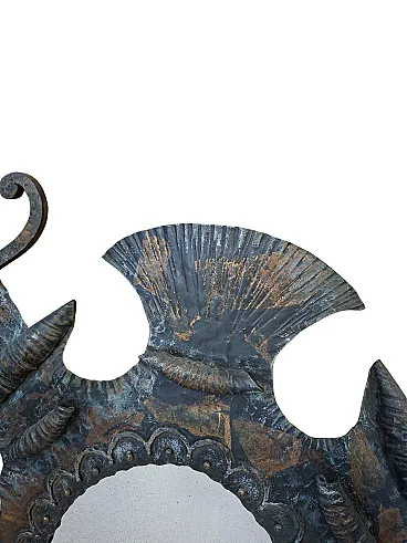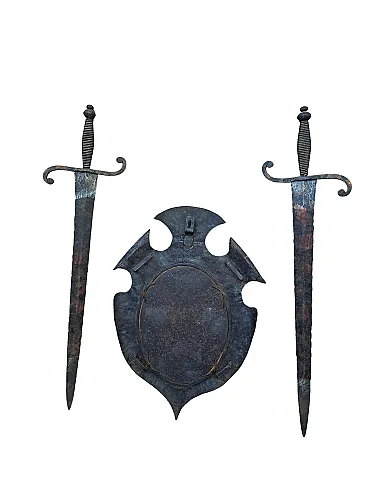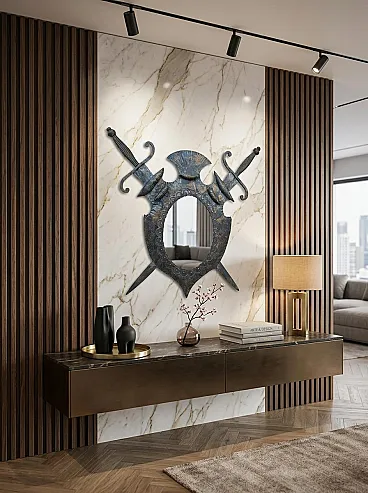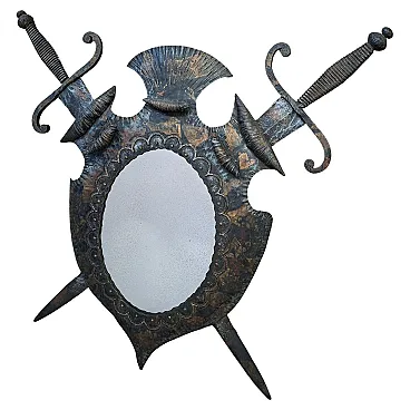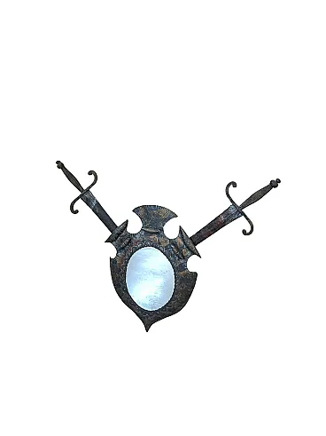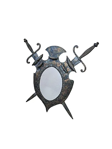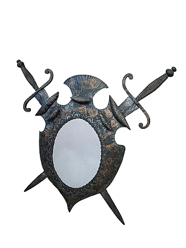 Aggiungi un tocco di fascino medievale e carattere al tuo ambiente con questo splendido specchio a forma di scudo, un vero oggetto di design vintage degli anni '70. Perfetto per arredare saloni, studi professionali, taverne o ingressi dallo stile deciso. Caratteristiche Principali: Artigianato: Realizzato interamente in ferro battuto con lavorazione dettagliata e bordo decorato. Design Unico: Lo specchio centrale è incastonato in una struttura a scudo. Il pezzo forte? Le due spade sono reali e completamente estraibili, permettendo di interagire con l'oggetto o di pulirlo con facilità. Dimensioni Generose: * Altezza: 74 cm Larghezza: 76 cm Solidità: Peso di circa 10 kg, a testimonianza della qualità dei materiali e della robustezza della struttura. Stato di conservazione: L'oggetto è in ottime condizioni vintage. La patina del ferro battuto conferisce quel sapore autentico e storico che solo i pezzi degli anni '70 sanno trasmettere.