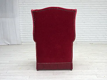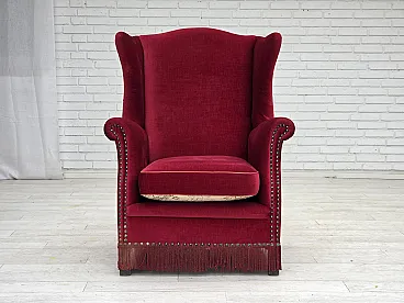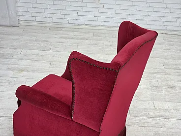 Poltrona danese schienale alto, velluto rosso, in frassino, anni '60