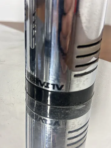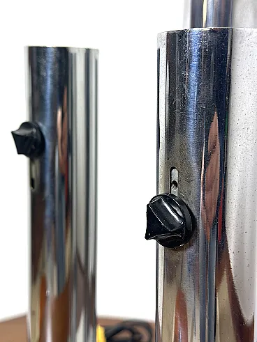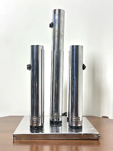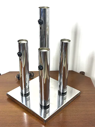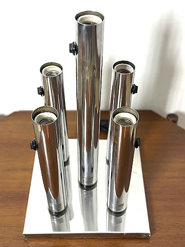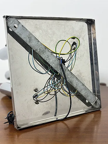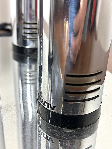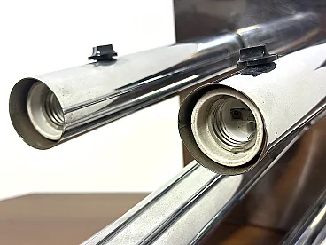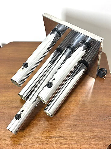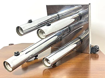 Applique straordinaria e piuttosto rara prodotta da Altalite, una divisione storica del prestigioso gruppo Targetti Sankey. Il modello è un perfetto esempio di design Space Age italiano degli anni '70, caratterizzato da un'estetica che richiama le canne d'organo o i motori a reazione, tipica della sperimentazione tecnologica di quel decennio. L'applique è composta da quattro cilindri in acciaio cromato di lunghezze decrescenti, montati su una base rettangolare specchiata. Ogni cilindro termina con un alloggiamento per lampadine E27, progettato per creare un fascio di luce direzionato e scenografico. Sono presenti cursori di accensione/regolazione neri sulla scocca dei cilindri, un dettaglio funzionale tipico della produzione Altalite che conferisce all'oggetto un aspetto "hi-tech" d'epoca. La base cromata riflette i cilindri stessi, raddoppiando visivamente il volume della lampada e creando profondità sulla parete. CONDIZIONI PERFETTE Misure; Altezza cm 50 - Profondità cm 29 - Larghezza cm 29
