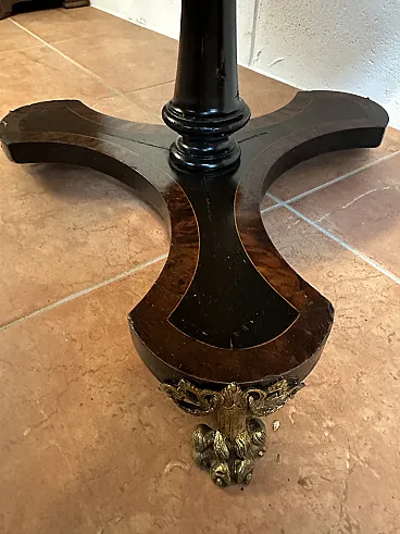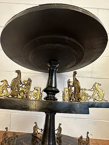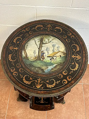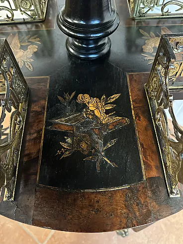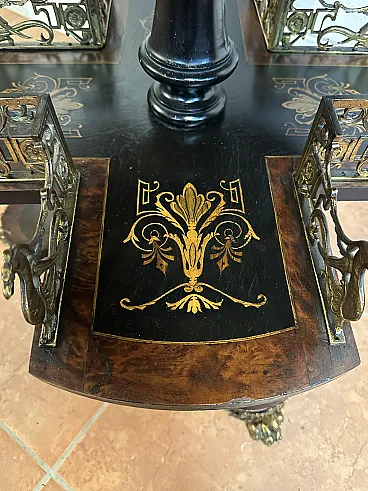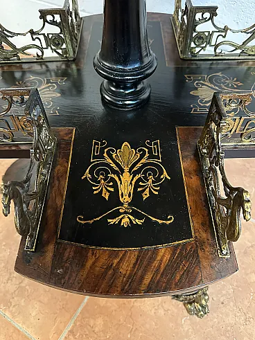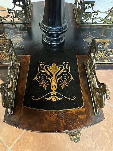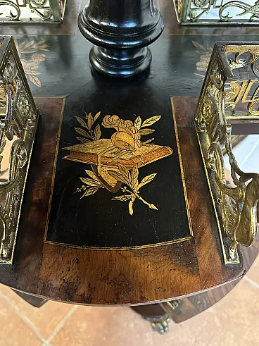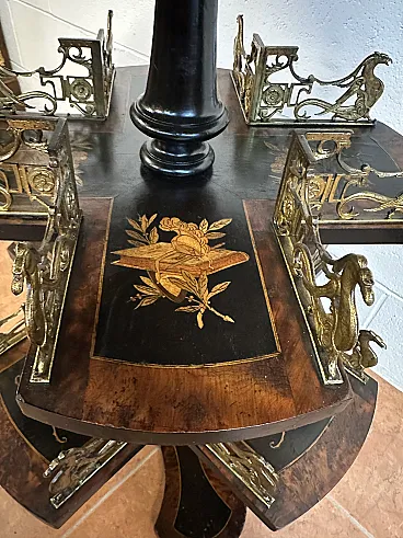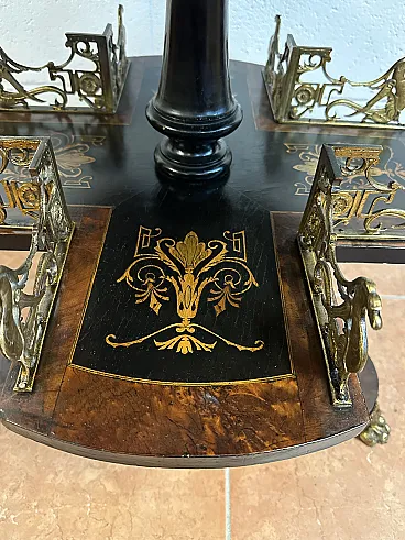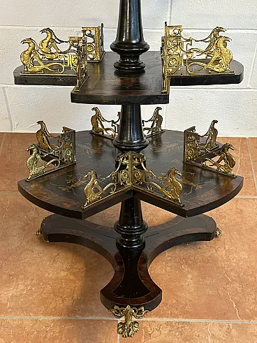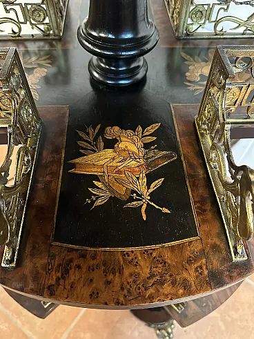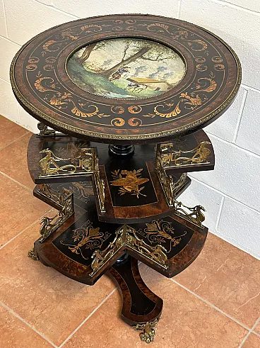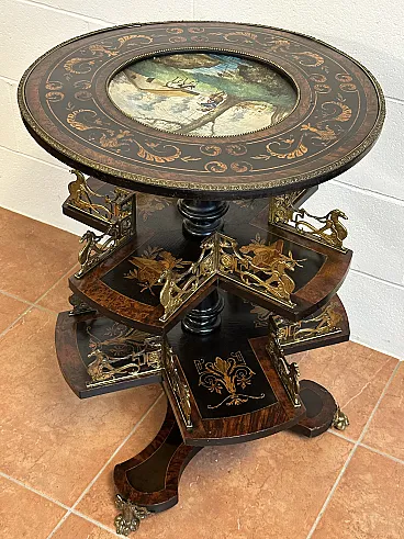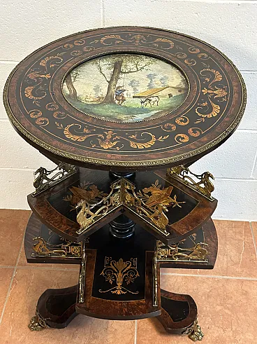 Questa rara ed elegante Libreria Girevole francese del periodo Napoleone III si distingue sia per l'originalità del design che per la ricchezza delle decorazioni e degli intarsi. Il piano circolare è contornato da intarsi particolarmente raffinati, su fondo ebanizzato nero, in mezzo a due fasce di radica di tuia, con al centro un “piatto” concavo con una scena bucolica dipinta; il tutto è impreziosito da una fascia in bronzo finemente cesellata, che aggiunge rilievo ed eleganza alla composizione. Il mobile poggia su una colonna centrale in legno ebanizzato, attorno alla quale si dispongono a stella diversi ripiani, formando una libreria girevole particolarmente ingegnosa. Questi ripiani ruotano attorno alla colonna centrale, consentendo un facile accesso ai libri disposti tutt'intorno. Ogni vano del ripiano girevole più basso è decorato con delicati intarsi floreali, mentre i vani del ripiano più alto sono decorati con una composizione d’intarsio con un elmo su un libro tra foglie e bacche; tutti gli intarsi sono su fondo ebanizzato e contornati da filetti in acero e fascia in radica di tuia. Pregevoli applicazioni in bronzo dorato raffiguranti grifoni alati strutturano l'intera composizione. Queste applicazioni in bronzo non sono meramente decorative: fungono anche da supporti per tenere fermi i libri, agendo sia da fermalibri che da elementi architettonici. La base a treppiede, anch'essa riccamente decorata, termina con artigli in bronzo dorato, accentuando il carattere scultoreo e prestigioso del pezzo. Grazie alla raffinatezza del suo meccanismo girevole, alla ricchezza degli intarsi e alla qualità delle sue montature in bronzo, questo libreria girevole è un pezzo di arredamento particolarmente raro e spettacolare del periodo napoleonico Ill, che funge sia da tavolo da biblioteca che da splendido oggetto decorativo multiuso. Lo stato di conservazione generale,visto l’epoca, è molto buono, la struttura è sana e perfettamente funzionante. Non ci sono mancanze di bronzi, l’intarsio è integro e tutto originale,ad eccezione di una delle quattro composizioni sul piano girevole più alto,come si può vedere dalle numerose foto. Il piatto incassato, con il dipinto in buona conservazione, ha una filura in tutta la lunghezza che però non da fastidio.