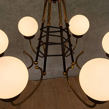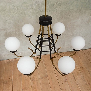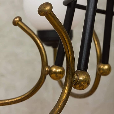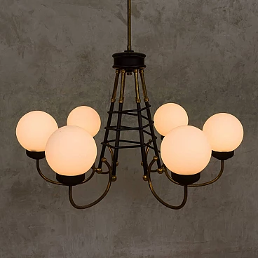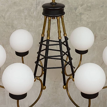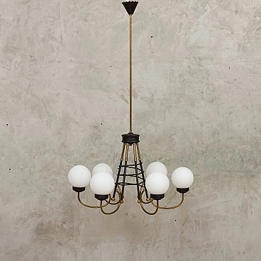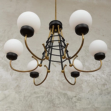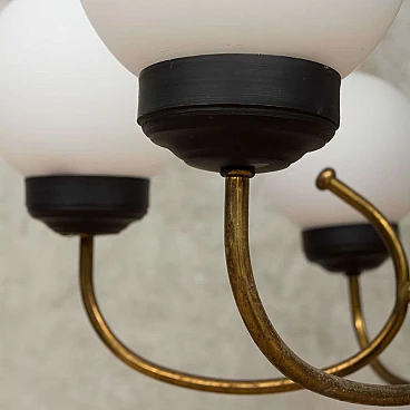 Lampadario in ottone, metallo verniciato e vetro opalino di Stilnovo, anni 60