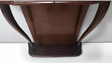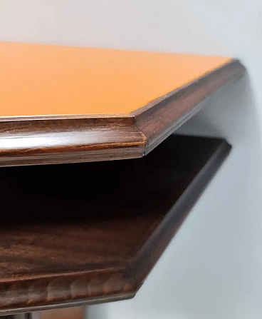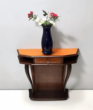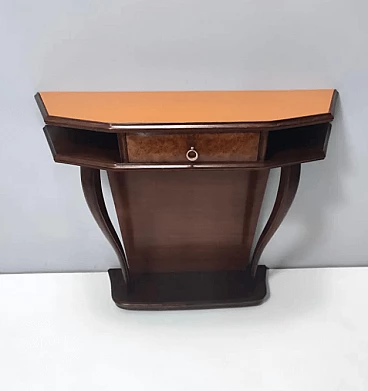 Consolle in faggio e radica di noce con piano in vetro arancione, anni '50