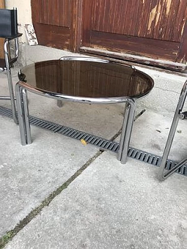 Tavolino rotondo in metallo cromato con piano in vetro, anni '60