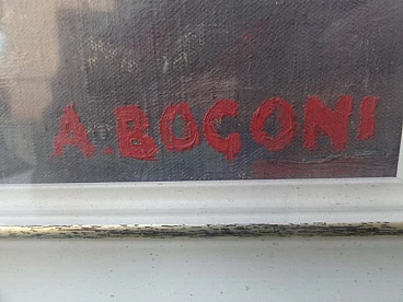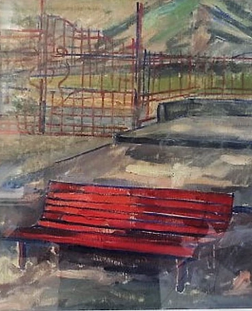Adriano Bogoni, veduta con panchina rossa, dipinto a olio su tela