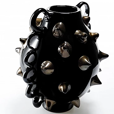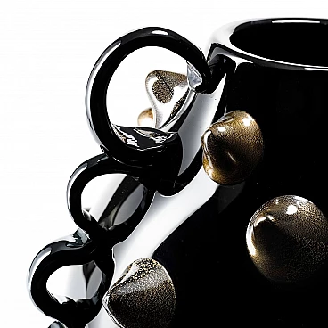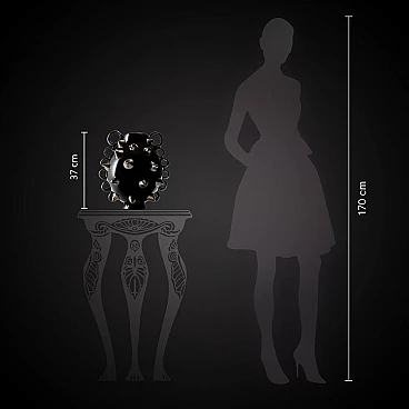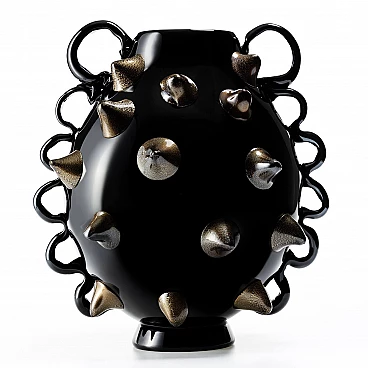 Vaso scultoreo in vetro di Murano, pezzo unico. Realizzato con maestria e precisione dai maestri di 1295-Murano, questo vaso-scultura in vetro artistico è un'opera complessa e affascinante, tecnicamente molto complessa. Fa parte di una serie di pochi esemplari, ciascuno con caratteristiche uniche, ispirati alle diverse sfaccettature dell'umanità. Questa opera, nominata Murano Essence, è di grande impatto, bellezza e valore. La sua lavorazione a mano lo rende un pezzo unico e prezioso, mentre il colore nero pieno gli conferisce un'aura di mistero e fascino. Le borchie in vetro soffiato e foglia oro 24kt, applicate una a una con la tecnica dell'incalmo durante la lavorazione, donano un tocco di lusso, creando un contrasto interessante con la superficie del vetro soffiato. Ma non è solo la sua bellezza ad attirare l'attenzione di chi lo osserva: il vaso nasce da una riflessione profonda sulla complessità dell'essere umano, rappresenta l'interconnessione delle nostre emozioni, esperienze e sfaccettature interiori; ciascuna borchia rappresenta un momento unico nella vita di ognuno di noi. Il vaso incarna l'essenza stessa dell'umanità, che si manifesta attraverso l'arte in una forma unica e provocatoria, un esempio di come l'arte possa esplorare la profondità dell'essere umano e trasformare le emozioni in opere originali e sorprendenti.