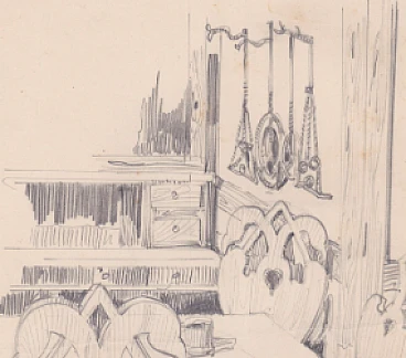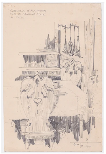 Arredi di una sala in legno intagliato. La composizione è condotta con un segno per linee parallele, più o meno marcato in base alle esigenze del chiaroscuro, forse pensato per un’illustrazione. In alto a sinistra si legge: Cortina d’Ampezzo/Casa di Agostino Colle/al museo.