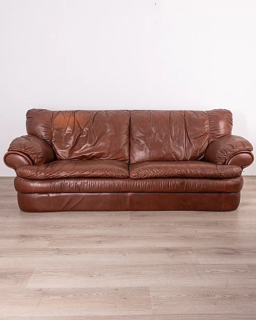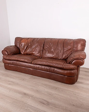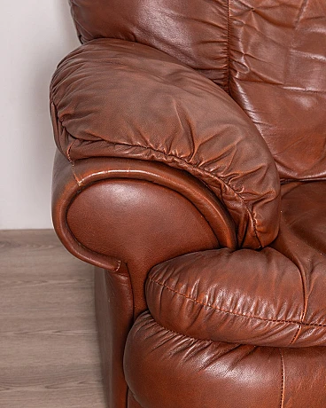 Divano a 2 posti in legno e pelle marrone, anni '70