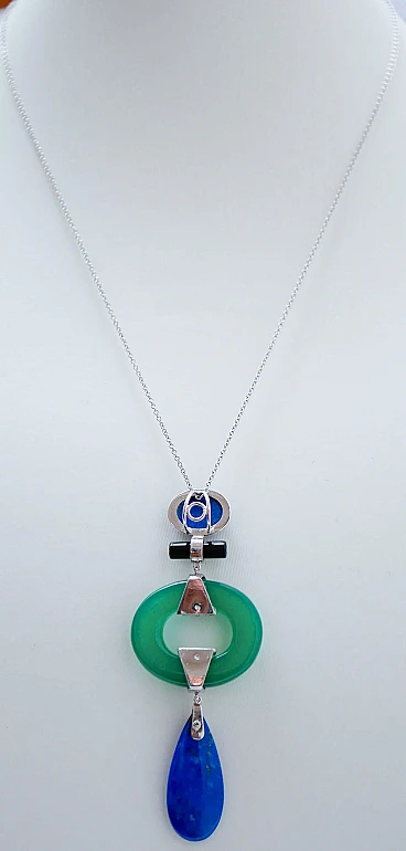 Incredibile collana con struttura in platino montata con un lapis nella parte superiore; al centro, strutture tempestate di diamanti, un'onice e un'agata verde. Come ciondolo, un lapis a goccia. La catena in oro bianco 14 kt è inclusa. Questo ciondolo è stato realizzato completamente a mano da maestri orafi italiani ed è in perfette condizioni. Diamanti 0,55 ct. Onice 0.40 gr. Lapis 2,90 gr. Agata verde 6.50 gr. Peso totale 18.40 gr RF +OFEF. Lunghezza catena 46 cm, lunghezza ciondolo 8 cm. Per qualsiasi informazione, sentiti libero di contattare il venditore attraverso il centro messaggi.