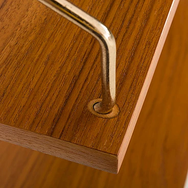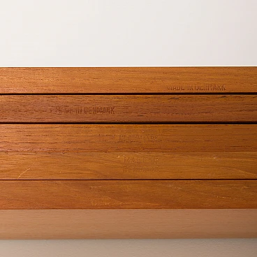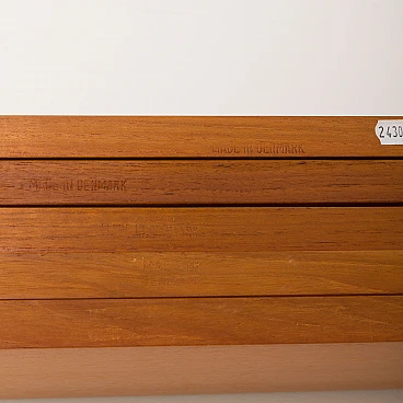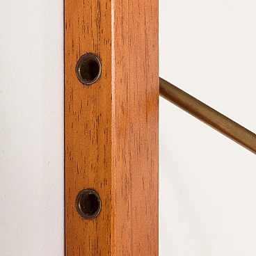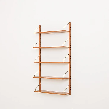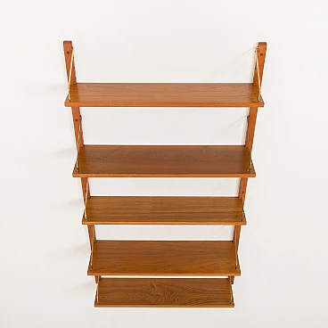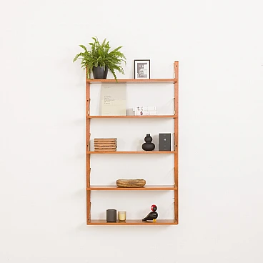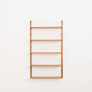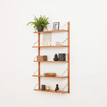 Sistema di scaffalature modulari vintage danese semplice ma elegante in stile Poul Cadovius. Questo pensile danese è interamente modulare con cinque ripiani impiallacciati in teak appesi tramite ganci in ottone su binari in legno massello. Poiché tutti i ripiani sono larghi 80 cm, possono essere spostati più in basso, più in alto e scambiati. Può essere organizzato secondo la propria volontà. Inoltre, sul retro di ogni ripiano è presente l'incisione originale del produttore "Made in Denmark". Questo pensile vintage funzionerà bene in ufficio così come in soggiorno o in camera da letto.