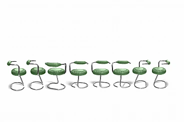 Set di 8 sedie Cobra verdi è un set di sedie realizzato negli anni '70 da Giotto Stoppino (Milano, 1926). Struttura in tubolare d'acciaio cromato e tessuto azzurro. Questa sedia "Cobra" è stata progettata da Giotto Stoppino negli anni '70 e prodotta in Italia. Giotto Stoppino nasce a Milano nel 1926. Studia a Venezia poi a Milano, dove si laurea nel 1951. Dal 1953 al 1968 lavora presso lo studio “Architetti Associati” fondato da Vittorio Gregotti e Lodovico Meneghetti. Contemporaneamente aderisce all'ADI, associazione dedicata al disegno industriale (ne sarà anche presidente dal 1982 al 1984). Alla fine degli anni '60 Stoppino fonda il proprio studio di architettura e design. Nel 1972 presenta la lampada "537" (Arteluce) e un gruppo di tavolini (Kartell) durante la famosa mostra "Italia: il nuovo paesaggio domestico" a New York. Come designer di talento, ha ricevuto il prestigioso premio Compasso d'Oro nel 1979 per la sua credenza Sheraton. Stoppino ha segnato profondamente il design italiano con il suo approccio innovativo.