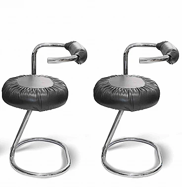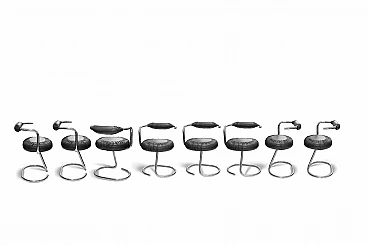 Set di 8 sedie Cobra nere è un set di sedie realizzato negli anni '70 da Giotto Stoppino (Milano, 1926). Struttura in tubolare d'acciaio cromato e tessuto azzurro. Questa sedia "Cobra" è stata progettata da Giotto Stoppino negli anni '70 e prodotta in Italia. Giotto Stoppino nasce a Milano nel 1926. Studia a Venezia poi a Milano, dove si laurea nel 1951. Dal 1953 al 1968 lavora presso lo studio “Architetti Associati” fondato da Vittorio Gregotti e Lodovico Meneghetti. Contemporaneamente aderisce all'ADI, associazione dedicata al disegno industriale (ne sarà anche presidente dal 1982 al 1984). Alla fine degli anni '60 Stoppino fonda il proprio studio di architettura e design. Nel 1972 presenta la lampada "537" (Arteluce) e un gruppo di tavolini (Kartell) durante la famosa mostra "Italia: il nuovo paesaggio domestico" a New York. Come designer di talento, ha ricevuto il prestigioso premio Compasso d'Oro nel 1979 per la sua credenza Sheraton. Stoppino ha segnato profondamente il design italiano con il suo approccio innovativo.