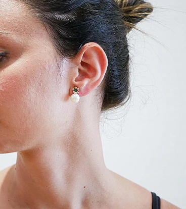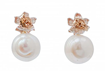 Orecchini con perle bianche da 11 mm, smeraldi, diamanti e fiori in oro rosa.