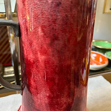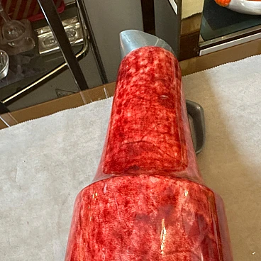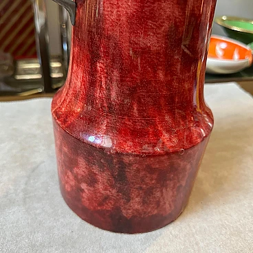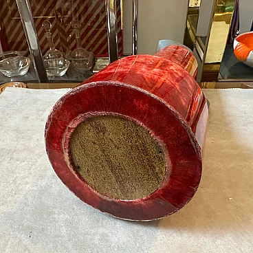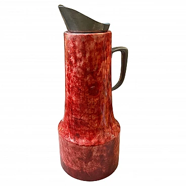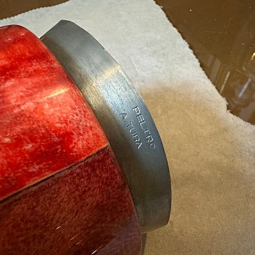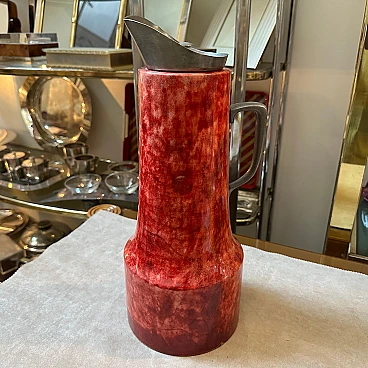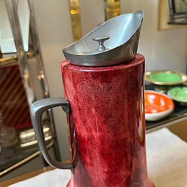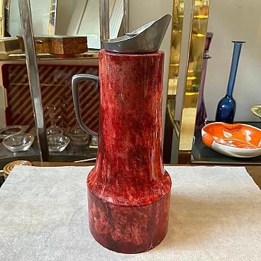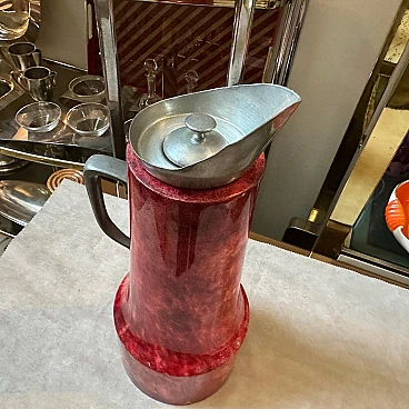 Caraffa termos in peltro e pelle di capra rossa, disegnata da Aldo Tura e prodotta da Tura Creazioni Milano, è in ottime condizioni, la pelle di capra rossa è complessivamente in buone condizioni, il peltro ha la patina originale e la scritta Aldo Tura su un lato. La caraffa ha un design elegante e minimalista ed è stata progettata per mantenere le bevande calde o fredde per lunghi periodi di tempo. La combinazione di peltro e pelle di capra rossa crea un'estetica calda e invitante, emblematica dello stile tipico di Tura. Il design moderno di metà secolo è stato un movimento popolare a metà del XX secolo, caratterizzato da linee pulite, ornamenti minimi e un'enfasi sulla funzionalità e sulla semplicità. La caraffa di Tura esemplifica questi principi, con la sua forma semplice ed elegante. Oggi, una caraffa thermos Mid-Century Modern di Aldo Tura degli anni '50 è un oggetto da collezione tra gli appassionati di design moderno della metà del secolo e di oggetti da tavola vintage.