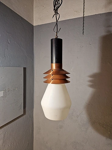 Lampadario 1253 in rame e vetro opalino di Stilnovo, anni '50
