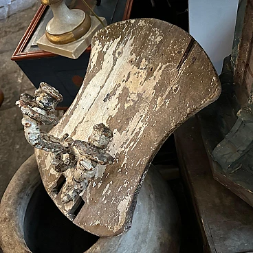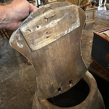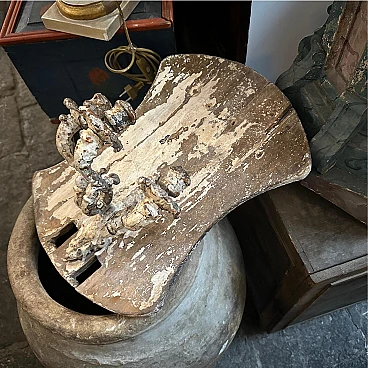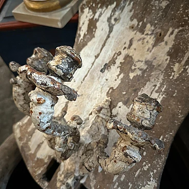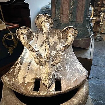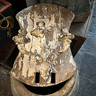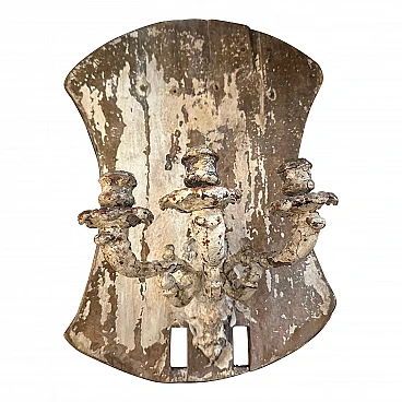 Questa applique siciliana in legno e ferro del XIX secolo è un oggetto decorativo e funzionale di ottima fattura che unisce le qualità robuste del ferro battuto al calore del legno intagliato. È in condizioni originali con segni evidenti di utilizzo e di età, probabilmente è stato utilizzato per abbellire una chiesa rurale. La piastra posteriore è una placca di legno intagliata. Dalla piastra posteriore si estendono tre bracci di ferro. Questi bracci sono graziosamente curvati e dimostrano la maestria del fabbro.