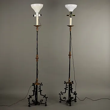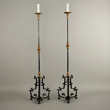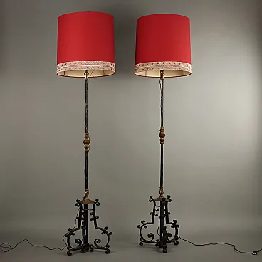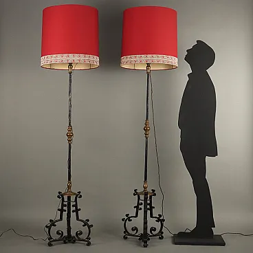 Coppia di Lampade da terra in ferro battuto e tessuto bordeaux, '800