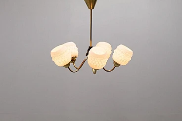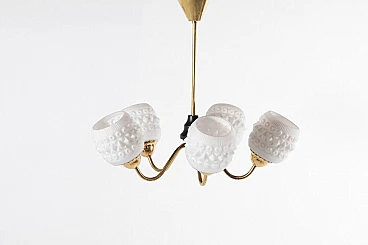 Lampadario in ottone con paralumi in cristallo bianco, anni '50