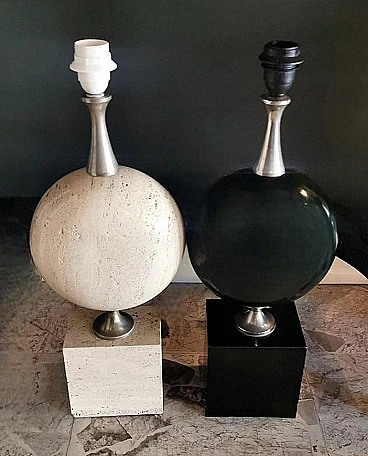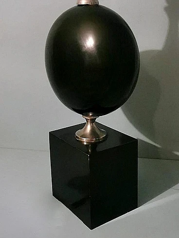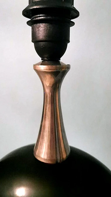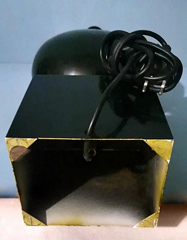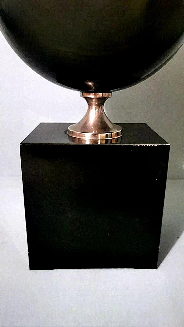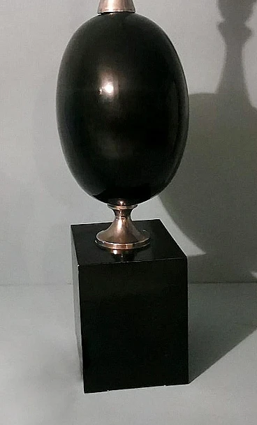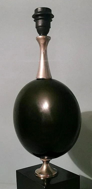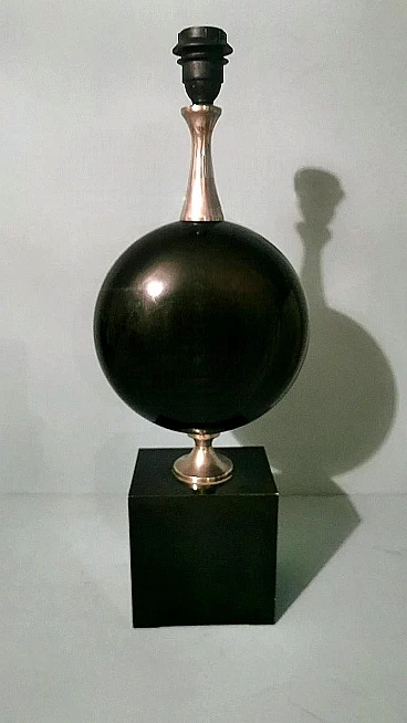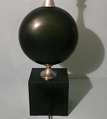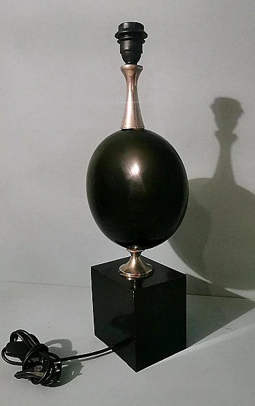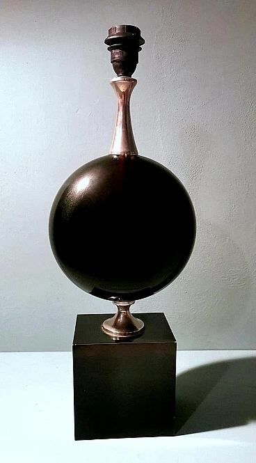 Ti invitiamo a leggere attentamente l'intera descrizione, in quanto ci proponiamo di fornirti informazioni tecniche e storiche dettagliate per garantire l'autenticità dei nostri articoli. Questa elegante lampada in metallo brunito presenta una base a forma di cubo che sostiene una perfetta figura geometrica rotonda e lenticolare tramite un attacco in ottone spazzolato e nichelato. Sopra c'è un altro raccordo in ottone tubolare e svasato, sormontato dal punto luce. Il design complessivo è esteticamente lineare e piacevole. Questa lampada è stata realizzata in Francia dalla Maison Barbier tra il 1960 e il 1965. La Maison Barbier era una piccola fabbrica situata nel cuore di Parigi, in Rue du Pré aux Clercs, vicino a Boulevard Saint-Germain. Fondata e diretta da Philippe Barbier, era un'azienda parigina nota per le sue creazioni di illuminazione e mobili negli anni '60 e '70. Philippe Barbier, rinomato designer del XX secolo, è riconosciuto per la sua abilità artigianale e i suoi design innovativi. Pur avendo disegnato diversi mobili e tavoli, divenne famoso per le sue originali lampade. Con le loro forme innovative, insolite e senza tempo, queste lampade sono diventate popolari in tutto il mondo e sono ancora molto amate dai collezionisti. Le lampade di Philippe Barbier sono state apprezzate non solo per il loro design unico, ma anche per la qualità dei materiali e dell'artigianato. Le sue creazioni erano caratterizzate da curve eleganti e forme distintive che le hanno rese popolari sia per l'uso domestico che per le produzioni cinematografiche. In particolare, famosi registi cinematografici utilizzavano spesso le lampade di Barbier sui loro set. Le lampade più iconiche di Philippe Barbier si distinguono per i materiali pregiati utilizzati, come l'acciaio cromato e brunito e il travertino. Le sue lampade combinano elementi di design neoclassico con un tocco moderno e spaziale, dando vita a pezzi eleganti e senza tempo. La nostra lampada ha un design moderno e contemporaneo, essenziale ma raffinato: un pezzo d'arredamento unico, elegante e sofisticato. Come puoi vedere nella foto, oltre a questa in metallo brunito, ne abbiamo un'altra identica nella forma ma realizzata in travertino, molto più pesante (visibile anche su questa pedana). La lampada è in buone condizioni e viene fornita senza paralume. L'impianto elettrico è nuovo, ma il cablaggio è europeo; la compatibilità della tensione in altri paesi deve essere sempre verificata da un elettricista prima dell'uso. Larghezza: 21 cm, profondità: 12 cm, altezza: 59 cm. Per tutte le nostre spedizioni utilizziamo materiali di imballaggio speciali (casse di legno, polistirolo, etc.) per garantire la massima protezione e sicurezza degli articoli.