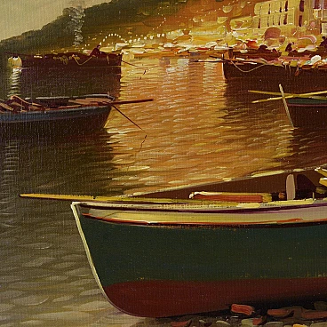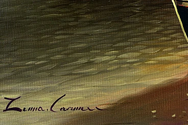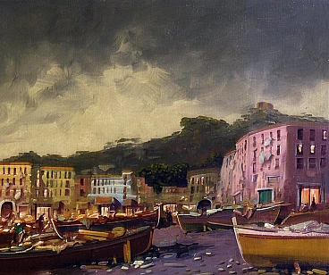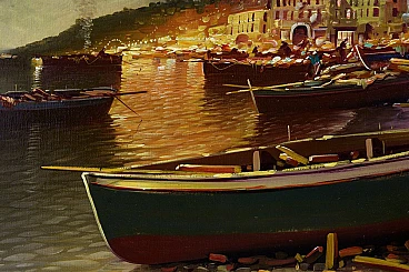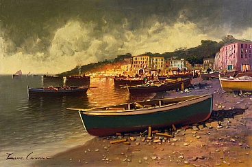 Questo dipinto a olio del rinomato artista napoletano Carmine Zenna cattura la serena bellezza di una serata costiera. Noto per le sue magistrali scene marine, Zenna impiega la sua eccezionale abilità per ritrarre un tranquillo villaggio marinaro illuminato dal caldo bagliore delle luci della sera. I dolci riflessi sull'acqua, le barche appoggiate sulla riva e le figure lontane creano una composizione armoniosa che evoca un senso di pace e nostalgia. Le pennellate minuziose e l'attenzione ai dettagli dell'artista danno vita alla scena, mentre l'uso di luci e ombre aggiunge profondità e dimensione al dipinto. I toni ricchi e caldi degli edifici contrastano magnificamente con le acque fredde e scure, mostrando l'abilità di Zenna nel bilanciare colore e forma. Questo dipinto testimonia il talento di Zenna e il suo profondo legame con i paesaggi marittimi di Napoli. Influenzato dal revival espressionista napoletano degli anni Ottanta, Carmine Zenna ritrae con appassionata espressività un paesaggio serale con un porto turistico, dove le luci della campagna illuminano la scena con colori caldi e rassicuranti.cm 60 x 90