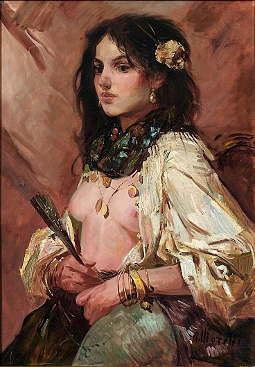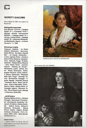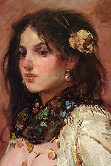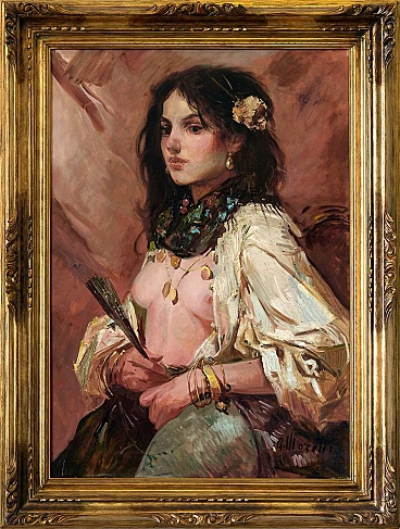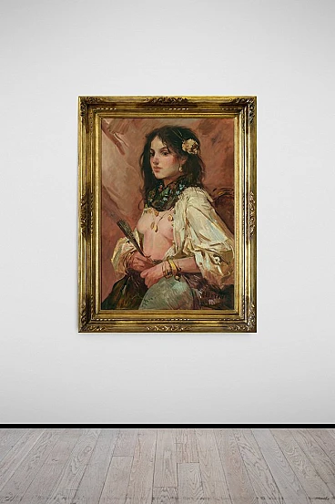 Questo splendido dipinto a olio di Giacomo Moretti cattura l'essenza della sua abilità artistica. Nato nel 1939, Moretti si è affermato come una figura importante nel mondo dell'arte, particolarmente nota per la sua tavolozza di colori intensi e brillanti, che danno vita ai suoi soggetti. La formazione dell'artista nel disegno accademico è evidente nella meticolosa attenzione ai dettagli e nel realismo profondamente personale che caratterizza il suo lavoro. Questa opera in particolare presenta una giovane donna il cui sguardo segue lo spettatore da qualsiasi angolazione, a testimonianza dell'abilità di Moretti nel creare ritratti realistici e coinvolgenti. I colori vibranti e la ricca texture della pittura a olio evidenziano la profondità e l'intensità dell'espressione del soggetto, rendendolo un'aggiunta irresistibile a qualsiasi collezione d'arte. Il dipinto misura 100x70 cm ed è elegantemente incorniciato in una cornice di legno dorata a foglia d'oro, che porta le dimensioni complessive a 123x93 cm. Questa cornice non solo esalta l'impatto visivo dell'opera, ma aggiunge anche un tocco di grandezza storica.
