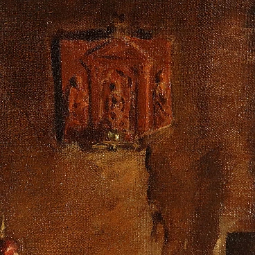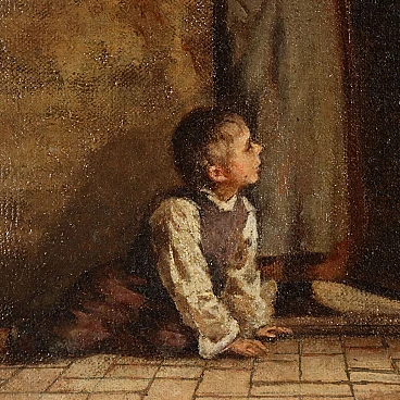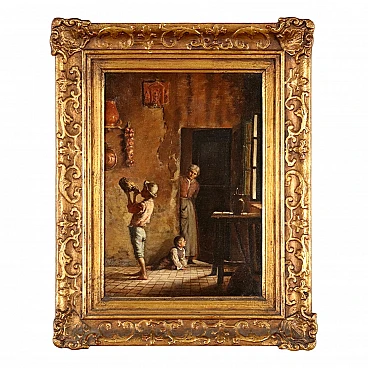 La scenetta, ambientata in una cucina rustica, raffigura un ragazzino che beve di nascosto dal fiasco di vino, ma non si accorge della madre che lo osserva nascosta dietro il vano della porta, guardata curiosamente dal sotto in su dal fratellino, carponi sul pavimento. La pittrice fiorentina Elena Nobili si distinse per queste scenette d'interno familiare, dal linguaggio espressivo immediato e semplice, esaltato da scelte coloristiche luminose ma delicate.