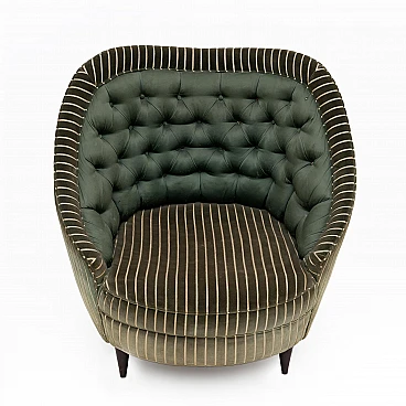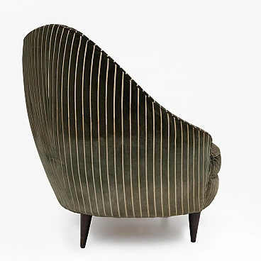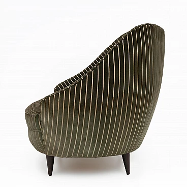 These four elegant mid-century Italian armchairs are not only comfortable, but incredibly elegant. Their unique design features a slightly sloping domed back and a scalloped front that ends in rounded, tapered beech legs. The chairs are perfect for a smaller seating area, offering a comfortable, solid seat with sloping sides to rest your arms on. Designed by Gio Ponti for Casa e Giardino in Italy in the 1940s. The armchairs have the original period upholstery, as pictured the fabric is worn and we would recommend re-upholstering. We can quote for re-upholstery, our old school upholsterers are masters at this. Price is for a single armchair, we also have the sofa. Shipping is per piece, we will provide a more accurate quote based on the number of pieces purchased.