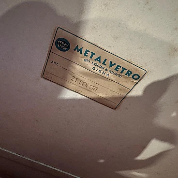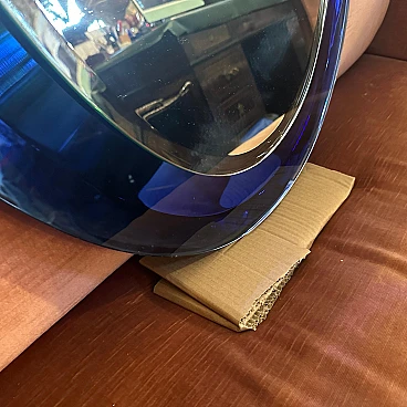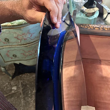 Questo specchio da parete ovale dell'era spaziale creato da Metalvetro Siena è un notevole pezzo di design della metà del XX secolo. Lo specchio presenta un'audace cornice blu intenso che incarna l'estetica futuristica caratteristica del movimento di design A Space AGE, popolare negli anni '60 e '70. La forma ovale è elegante e liscia e contribuisce al look moderno e aerodinamico tipico dell'epoca. Il telaio è probabilmente realizzato in materiale di vetro, possibilmente con una finitura lucida, che ne esalta il colore vibrante e gli conferisce una qualità leggermente riflettente. Questa particolare tonalità di blu è al tempo stesso sorprendente ed elegante, e rende lo specchio non solo funzionale ma anche un pezzo forte dell'arredamento. L'artigianato ha un alto livello di dettaglio e cura, con la superficie riflettente dello specchio stesso incorniciata perfettamente nell'ovale blu. Lo specchio si adatta a interni di ispirazione contemporanea o retrò, aggiungendo un tocco di design italiano vintage a qualsiasi spazio. È in condizioni originali, con i normali piccoli segni d'uso e d'età visibili nelle foto.