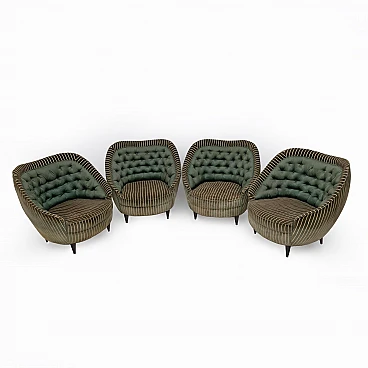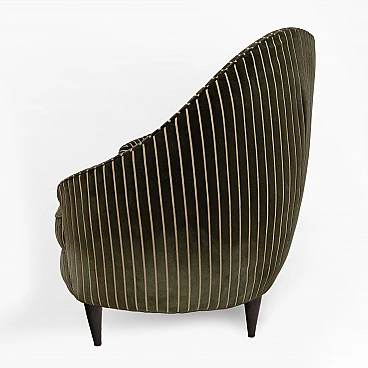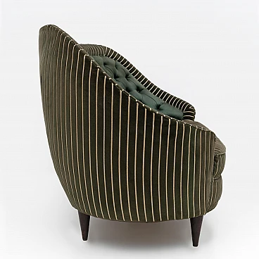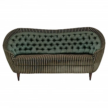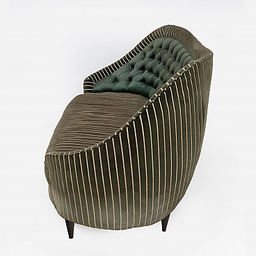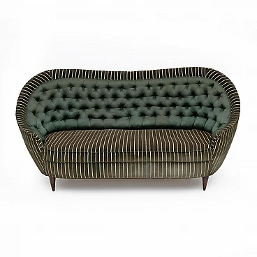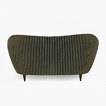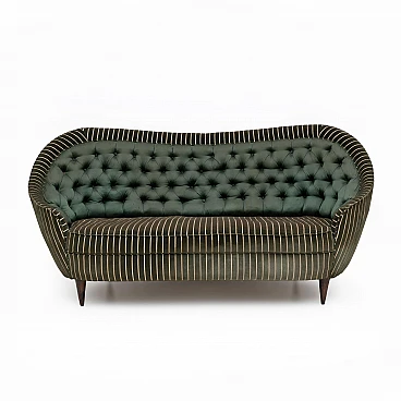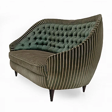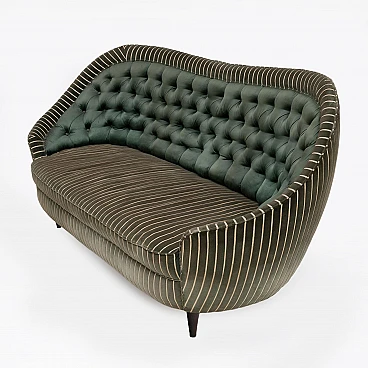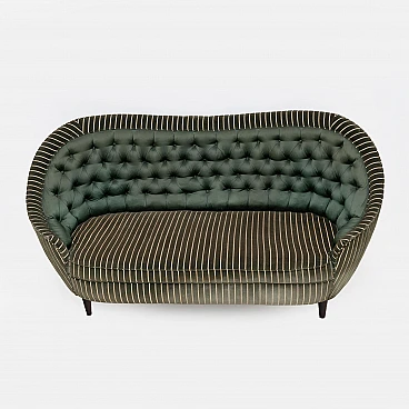 This elegant mid-century Italian sofa is not only comfortable, but also incredibly stylish. Its unique design features a gently sloping domed back and a scalloped front that ends in rounded, tapered beech legs. The sofa is perfect for a smaller seating area, offering a comfortable, firm seat with sloping sides to rest your arms on. Designed by Gio Ponti for Casa e Giardino in Italy in the 1940s. The sofa has the original period upholstery, as pictured the fabric is worn and we would recommend re-upholstering. We can quote for re-upholstery, our old school upholsterers are masters at this.
