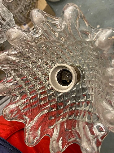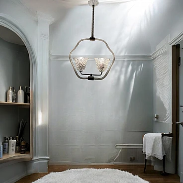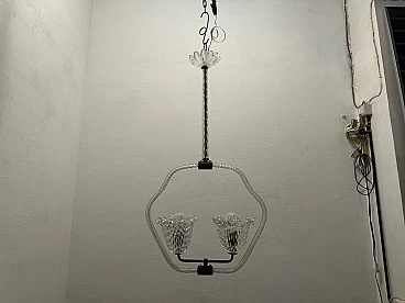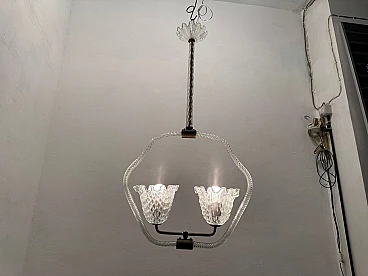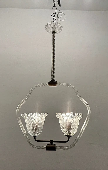 Pendente Barovier in vetro di Murano anni '50 Altezza con asta 92 cm Altezza senza asta 44 cm Larghezza 49 cm Profondità 17 cm Caratteristiche 2 luci Richiede lampadine E27 Cablaggio nuovo installato Compatibile con UK EU USA