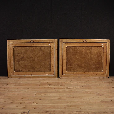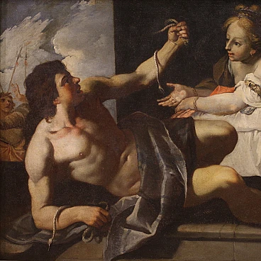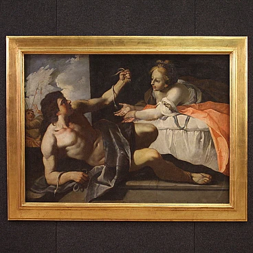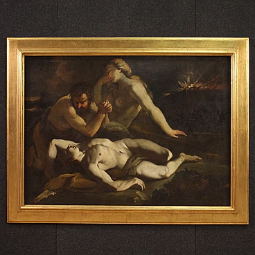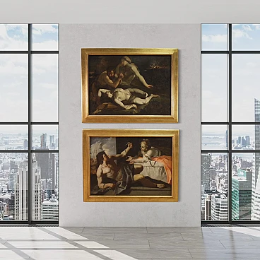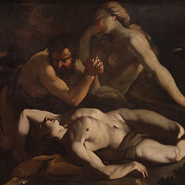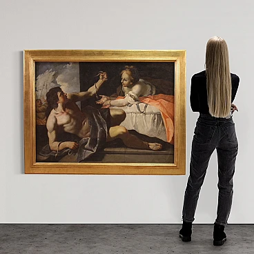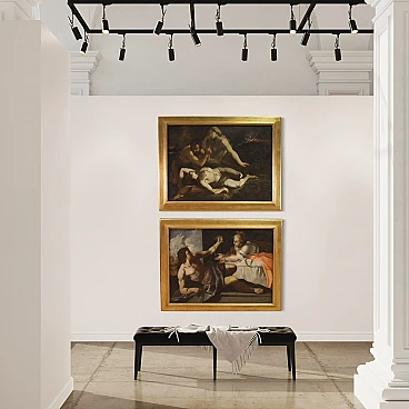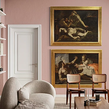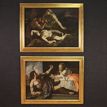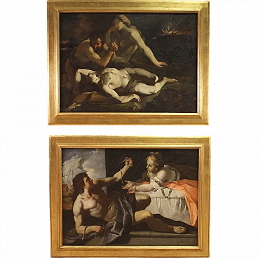 Raffinata coppia di quadri italiani della seconda metà del XVII secolo. Opere ad olio su tela raffiguranti due scene bibliche dal grande fascino, la morte di Abele e Giuseppe e la moglie di Putifarre. Nel primo dipinto vediamo infatti Adamo ed Eva sgomenti davanti al corpo esanime e diafano di Abele. Nel secondo quadro invece riconosciamo Giuseppe e la moglie di Putifarre, capo delle guardie del Re d'Egitto. La donna tenta di sedurlo e al suo rifiuto lo trattiene strappandogli la veste. Opere di notevole qualità pittorica, particolarmente evidente nella realizzazione degli incarnati e nei raffinati dettagli delle vesti. Cornici del XX secolo in legno intagliato e dorato, di bella decorazione, con alcuni segni del tempo. Opere già restaurate con rintelo, sostituzione del telaio e ripresa del colore in alcuni piccoli punti. Nel complesso in buono stato conservativo. Luce dipinto H 96 x L 132 cm.