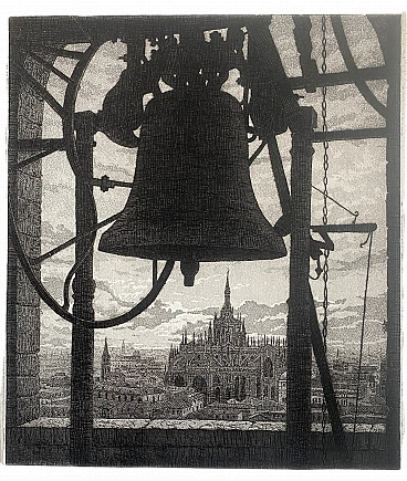 Insolita veduta a volo d’uccello della città di Milano. L’autore si colloca su un campanile e attraverso di esso, quai fosse un cannocchiale, propone uno scorcio cittadino. Il profilo nero di una campana e la struttura che la sorregge incorniciano la veduta cittadina dando vigore e monumentalità alla composizione. Al centro maestoso il profilo del Duomo svetta sopra i tetti di case e palazzi che si perdono all’orizzonte. Le nuvole nel cielo nascondono un sole che suggerisce la lice del tramonto. Monogramma e data incise sulla prima pietra a destra dell’apertura del campanile. Firma e titolo a matita in basso: Laurenzi, Milano. Impressione eccellente, ampi margini. Ottimo stato di conservazione.