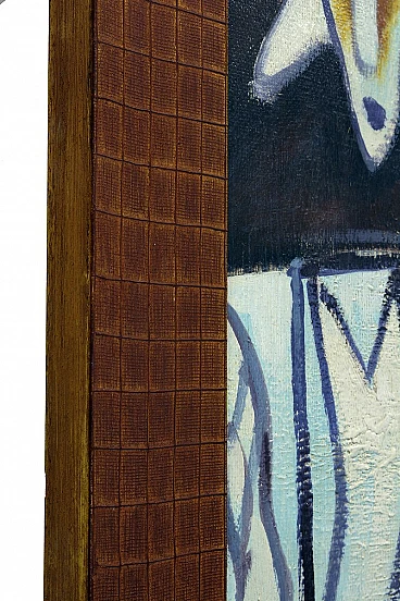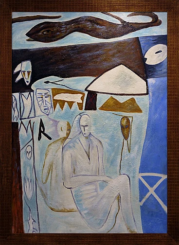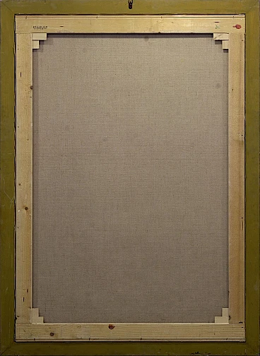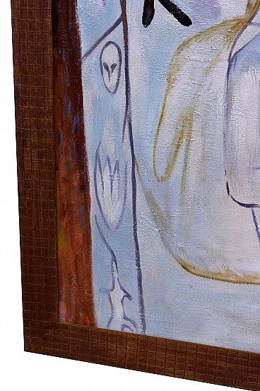 Enigmatico olio su tela nello stile di Mimmo Paladino Questo impressionante olio su tela, che misura 172x122 cm (senza cornice) e 186x136 cm (con cornice), evoca il mondo simbolico e stilizzato caratteristico di Mimmo Paladino. Il dipinto presenta figure e simboli enigmatici che si fondono in una composizione armoniosa, creando un effetto visivo potente e accattivante. L'esclusiva cornice in legno, con il suo caratteristico motivo a griglia, completa perfettamente l'opera d'arte, esaltandone l'estetica complessiva. Pur non essendo firmato, questo pezzo dimostra una profonda comprensione delle tecniche e dei temi tipici del maestro, rendendolo un pezzo unico e di grande interesse per i collezionisti e gli appassionati di arte contemporanea. Mezzo: Olio su tela Stile: Simbolico e stilizzato Soggetto: Figure e simboli enigmatici Cornice: Cornice unica in legno con caratteristico motivo a griglia Dimensioni: 172x122 cm (senza cornice), 186x136 cm (con cornice) Condizioni: Eccellente; sia il dipinto che la cornice sono ben conservati Quest'opera d'arte è un pezzo esemplare per coloro che apprezzano la profondità e la complessità dell'arte moderna, e diventerà sicuramente un punto focale in qualsiasi collezione.