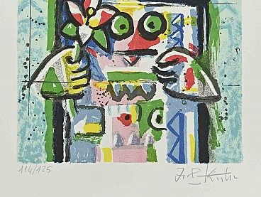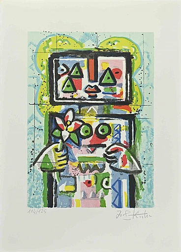 A Woman with Flower è una litografia realizzata da Ibrahim Kodra negli anni '80.Firmata a mano e numerata.Edizione di 125.Buone condizioni.Ibrahim Likmetaj Kodra (22 aprile 1918 – 7 febbraio 2006) è stato un pittore albanese.Nel 1944 aprì la sua primo workshop a Milano; nel 1948 inaugura una mostra personale e collettiva al "Club dell'Arte" di Roma, dove conosce e diventa amico di Pablo Picasso, con il quale spesso si confronterà su riflessioni artistiche. Nel 1950 dipinge affreschi nei più importanti musei e palazzi di Milano. Kodra ha poi aperto una mostra con Picasso, Henri Matisse, Amedeo Modigliani, Georges Rouault, Dufy e altri alla Mostra del Disegno di Chiavari (Italia).