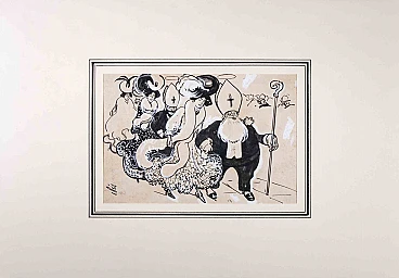 Church Men è un'opera d'arte moderna di Gabriele Galantara (1865-1937) degli inizi del XX secolo. L'opera è stata realizzata con tecnica mista di inchiostro e biacca su carta. Incluso un Passepartou: 35 x 50 cm Buone condizioni e invecchiata. L'opera è stato realizzato da Gabriele Galantara (1865-1937). È stato un giornalista e uno dei maggiori caricaturisti e fumettisti italiani. "L'Asino", settimanale pubblicato nel 1892 di cui Galantara firmò le illustrazioni, incontrò il favore del pubblico. Lo scopo della satira erano episodi di illeciti politici.