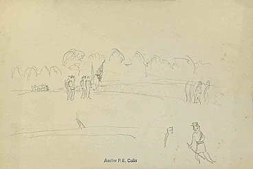 The Campsite è un disegno realizzato da Paul Emile Colin a metà del XX secolo. Matita carbone su carta color avorio. Timbrato nella parte inferiore. Buone condizioni con leggero foxing. L'opera è realizzata attraverso abili tratti espressivi.